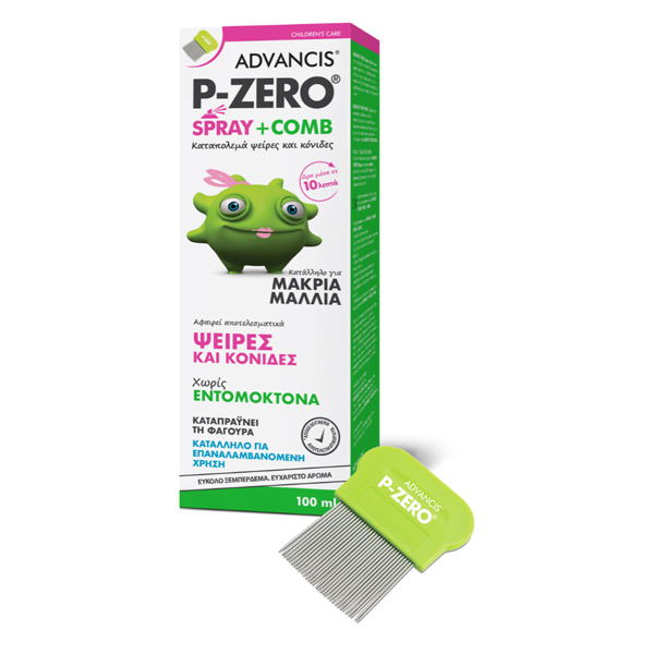 Το P-Zero Spray + Comb από την Advancis, είναι ιατροτεχνολογικό προϊόν Κατηγορίας Ι, το οποίο συνδυάζει μία λοσιόν σε μορφή σπρέι και μία χτένα με λεπτά δόντια.