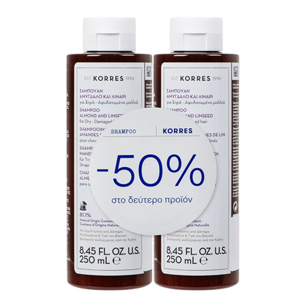 Σαμπουάν με Αμύγδαλο & Λινάρι από την Korres, που ενυδατώνει και θρέφει σε βάθος τα ξηρά, αφυδατωμένα μαλλιά, προλαμβάνοντας το σπάσιμο της τρίχας.