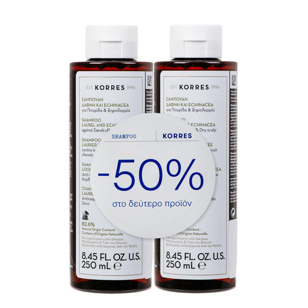 Εξειδικευμένο σαμπουάν κατά της Πιτυρίδας και Ξηροδερμίας από την Korres, με εκχυλίσματα από Δάφνη και Εχινάκεια, που φροντίζουν την υγεία του τριχωτού.