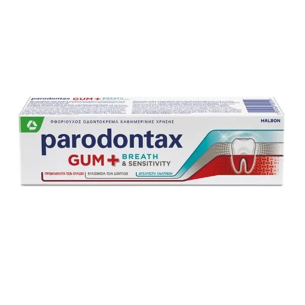 Η Parodontax Gum +Breath & Sensitivity είναι μια φθοριούχος οδοντόκρεμα καθημερινής χρήσης που είναι κλινικά αποδεδειγμένο ότι αντιμετωπίζει όχι μόνο τα προβλήματα των ούλων αλλά επίσης στοχεύει τη δυσάρεστη αναπνοή και την ευαισθησία των δοντιών που αυτά μπορεί να προκαλέσουν.