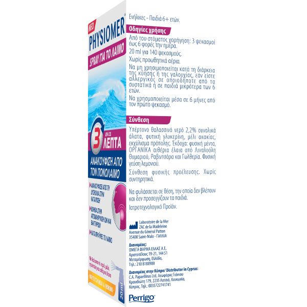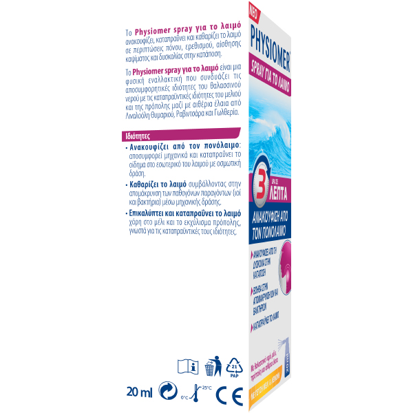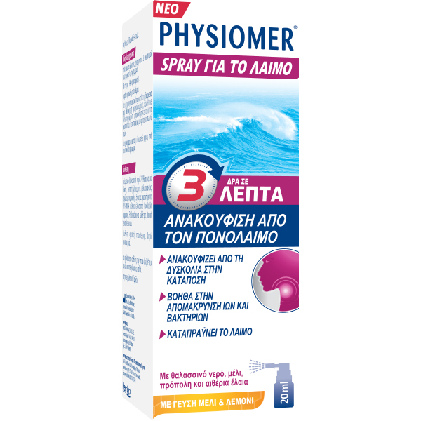 Πληρoφορίεs: To Psysiomer Σπρει για το λαιμό ανακουφίζει, καταπραΰνει και καθαρίζει το λαιμό σε περιπτώσεις πόνου, ερεθισμού, αίσθησης καψίματος και δυσκολίας στην κατάποση.